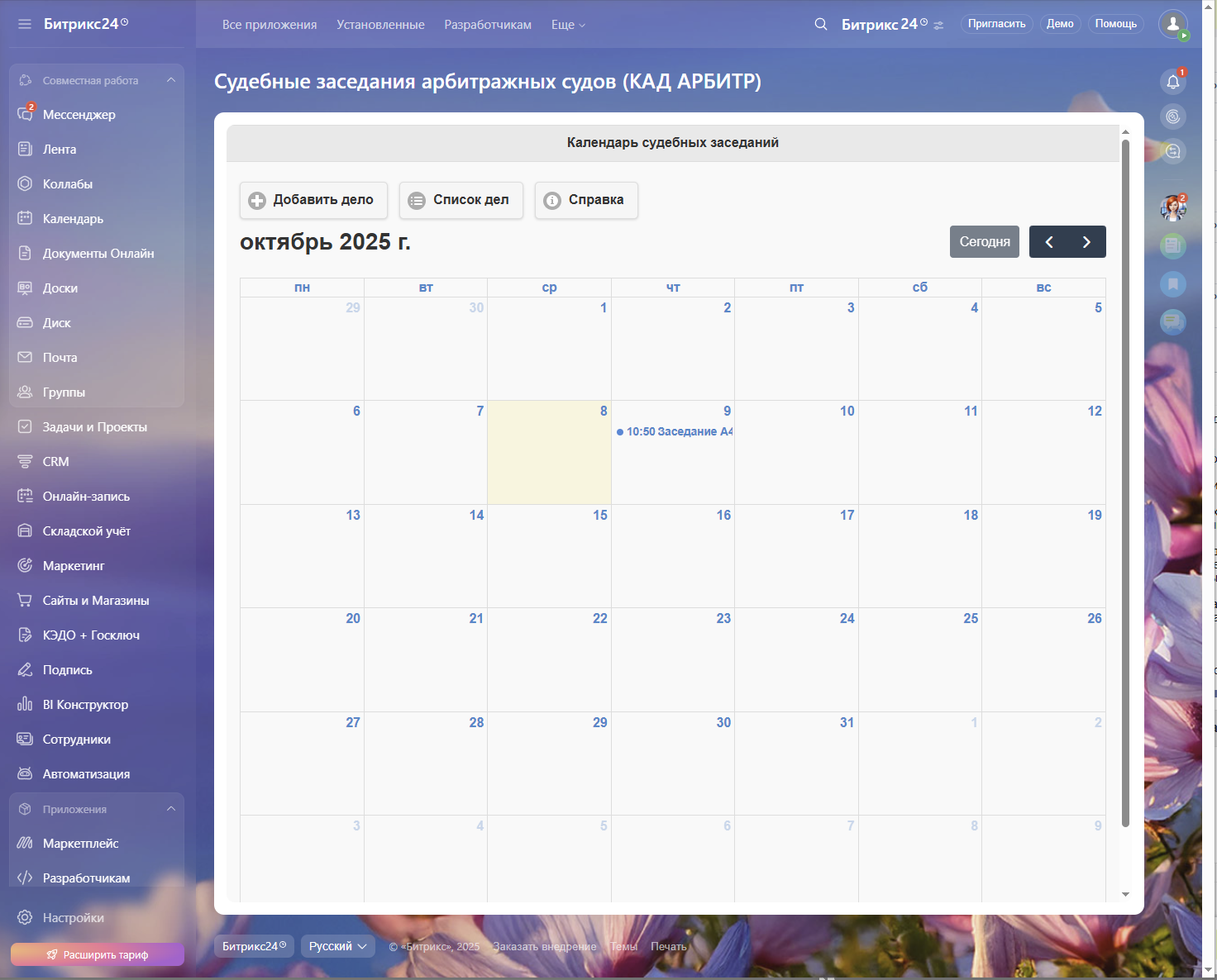 После этого в вашей Битрикс24 станет доступен модуль для отображения календаря судебных заседаний.