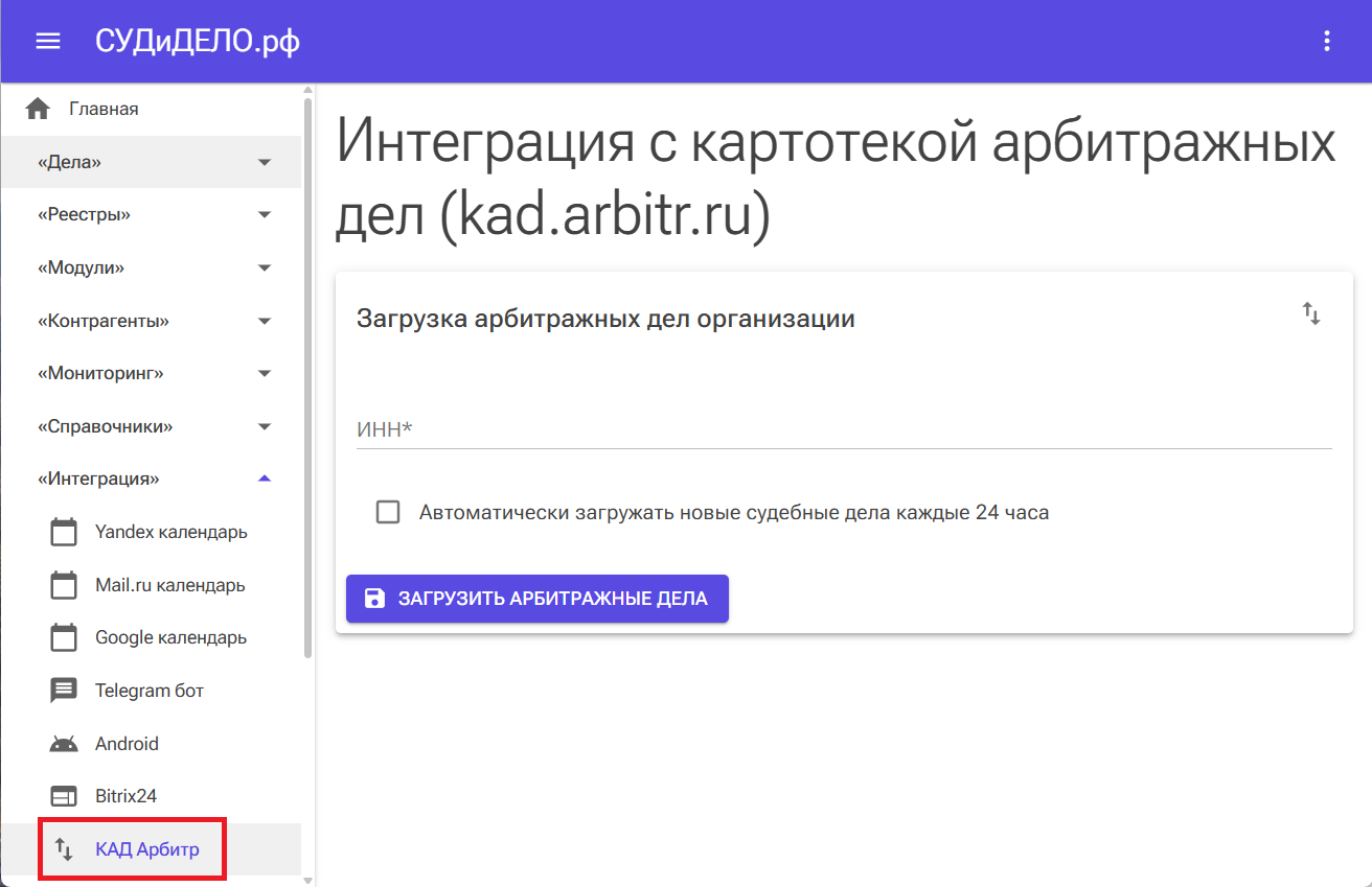 Для интеграции с арбитражными делами необходимо зайти в раздел «КАД Арбитр».