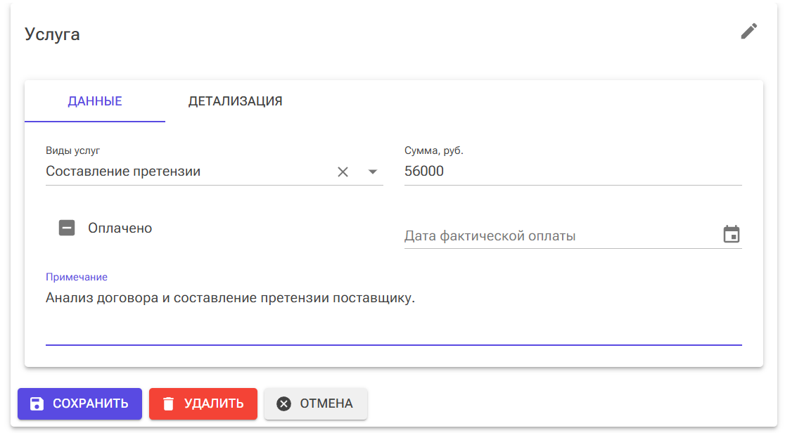 - При выполнении работ по судебному делу, фиксируйте все работы на вкладке «Финансы» в карточке судебного дела.