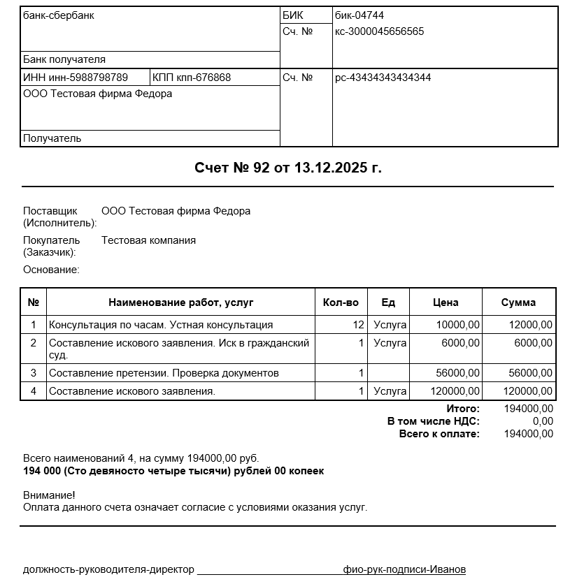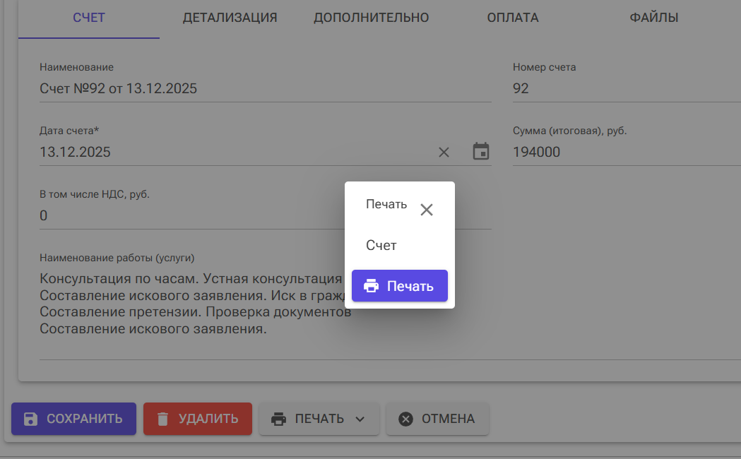 Распечатайте счет по юридическим услугам и передайте его для оплаты клиенту.