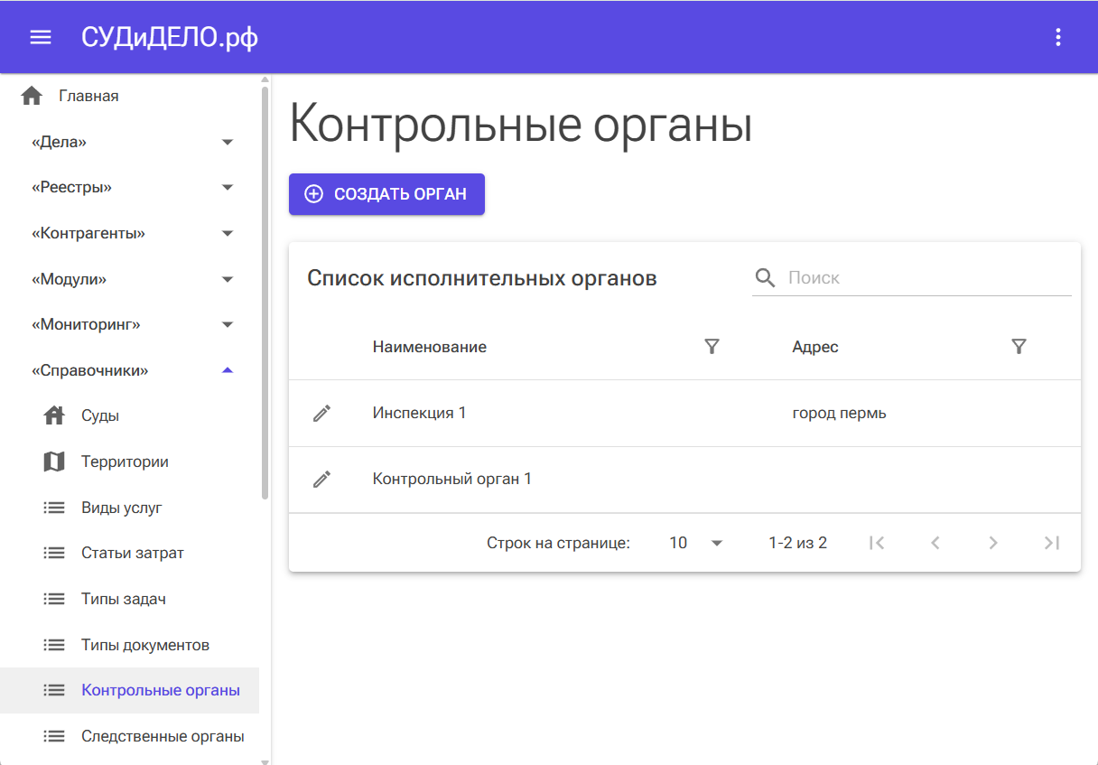 Зайдите в раздел «Справочники — Контрольные органы», в котором можно указать контрольные органы, с которыми взаимодействует ваш юридический отдел.
