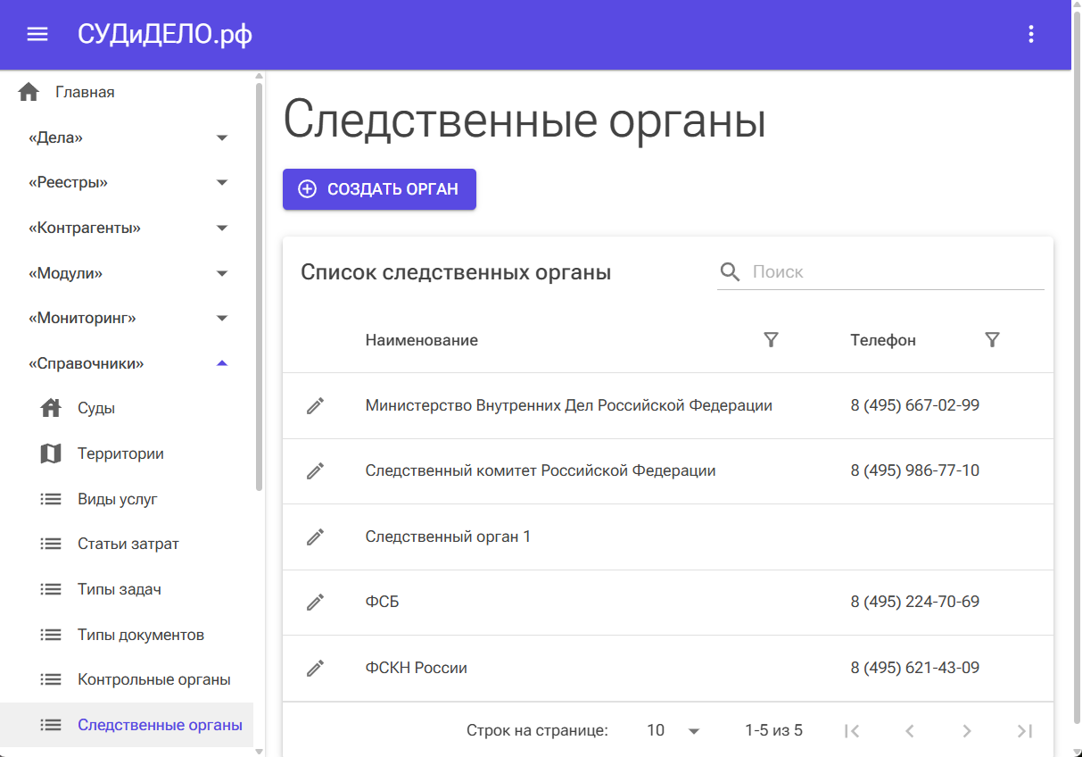 Зайдите в раздел «Справочники — Следственные органы», чтобы задать список следственных органов, с которыми взаимодействуют юристы вашей организации.