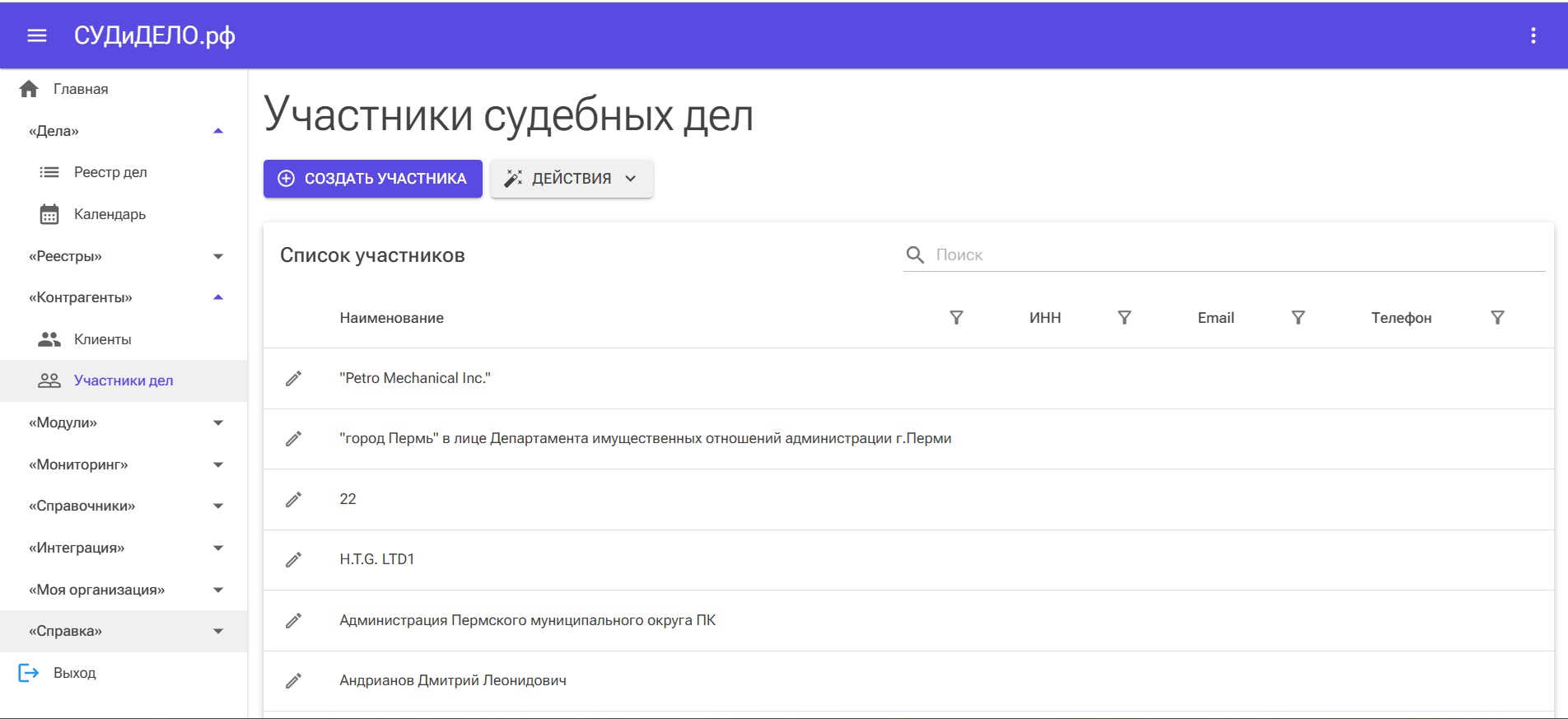 Раздел «Участники судебных дел» служит для ведения списка участников судебных дел в CRM системе. Зайдите в раздел «Контрагенты — Участники дел», чтобы найти нужных участников судебных дел. Создавать новых участников судебных дел можно в карточке судебного дела на вкладке Участники.